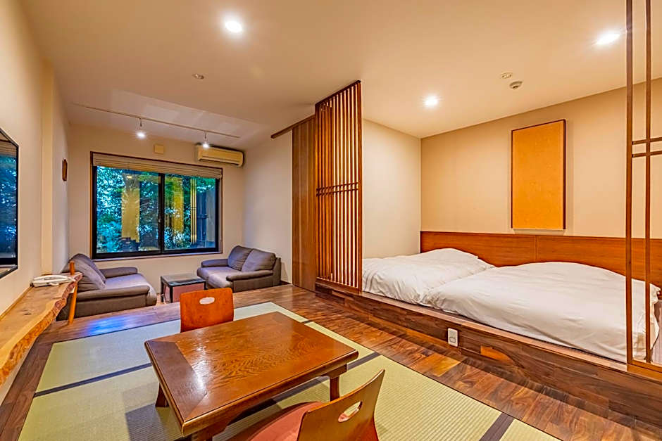 This spacious room features a private open-air hot spring bath, tatami (woven-straw) flooring and traditional futon bedding.